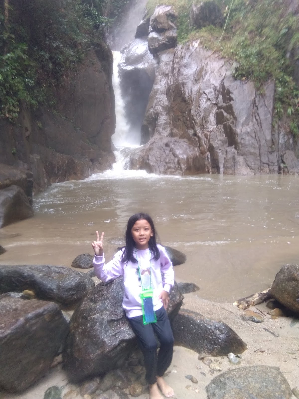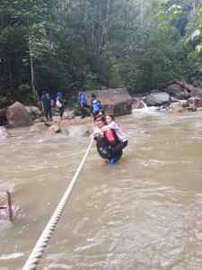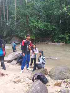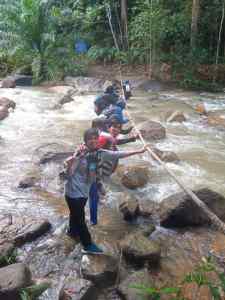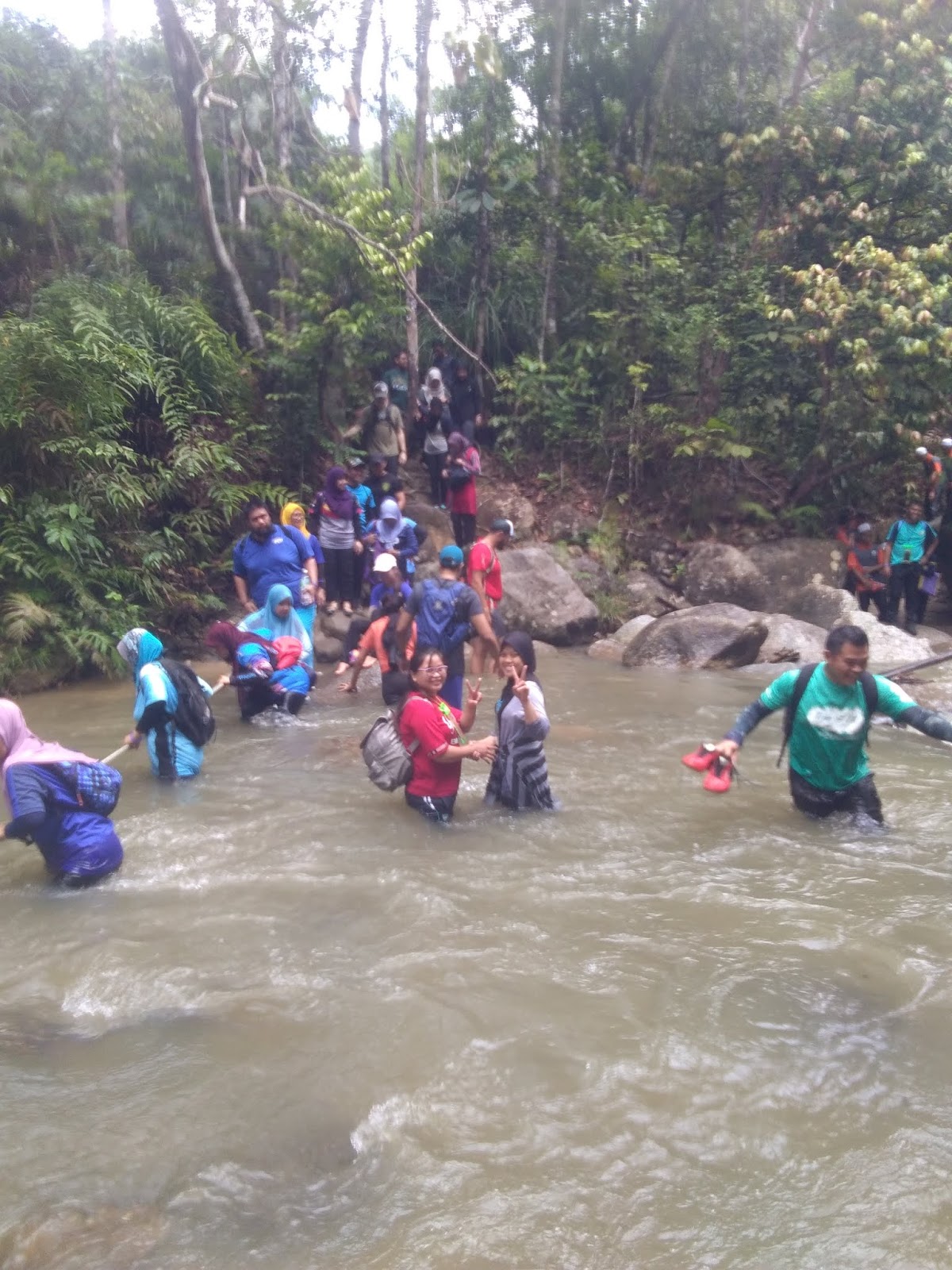 Untuk sampai ke air terjun, kami harus tempuh 5 halangan. Kebetulan semasa kami datang baru lepas hujan jadi air sedikit keruh dan arus sedikit deras tapi masih boleh kami tempuh.